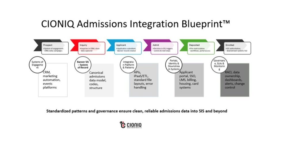CIONIQ’s Admissions Integration Blueprint™ was built to address this exact problem — with Banner as the system of record, but patterns that extend cleanly to other SIS and CRM platforms.