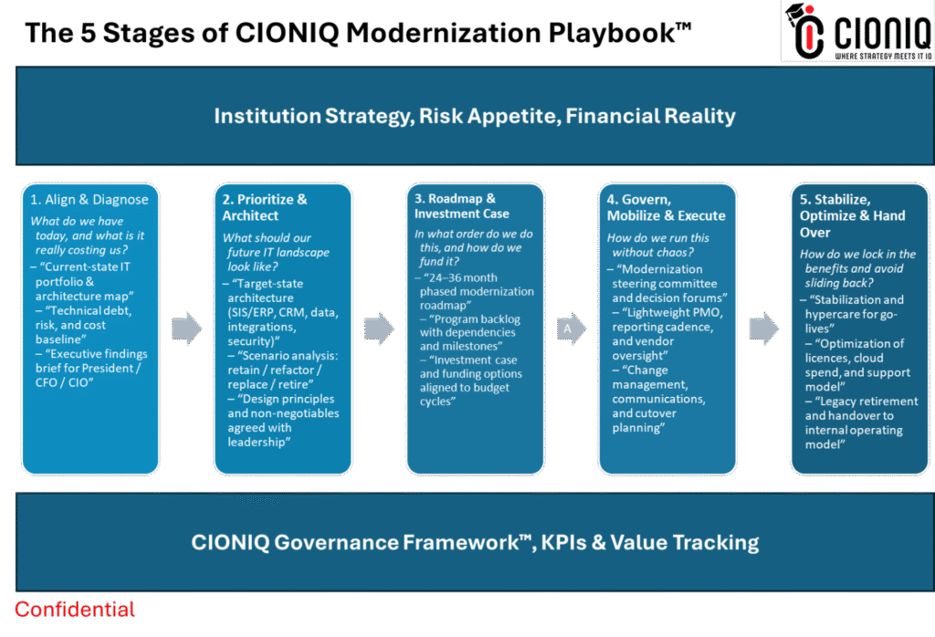 The CIONIQ Modernization Playbook™ is a structured, repeatable approach that takes a higher-ed institution from “we know we need to modernize” to “we know exactly what to do, when, and how.”